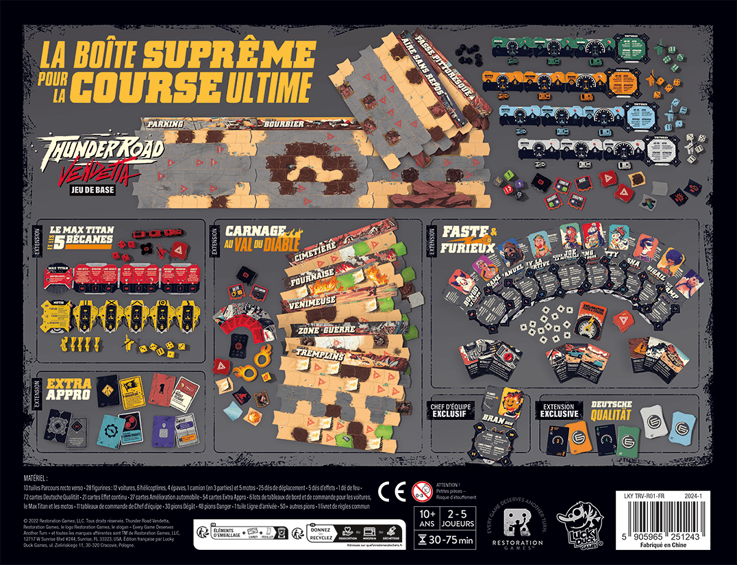 Thunder Road Vendetta : Maximum Chrome est la version revisitée du classique “Le Survivant” de 1986 : Faites chauffer vos moteurs, lancez vos dés, faites la course, tirez avec vos armes et essayez de ne pas vous faire exploser.