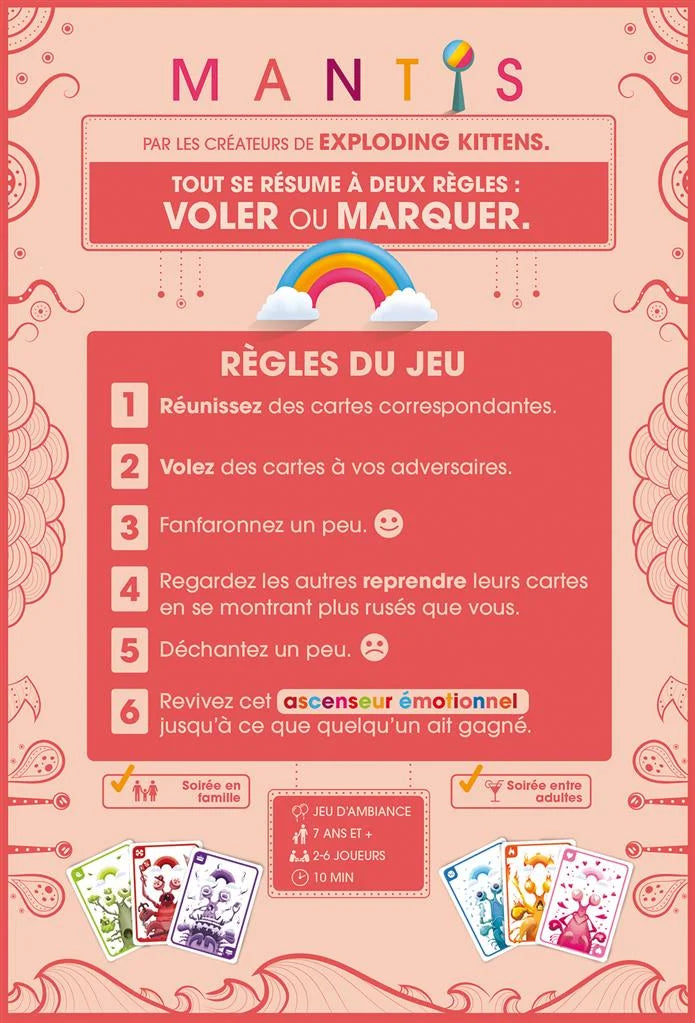 Il n’y a que deux règles : Volez ou Marquez. Collectionnez des cartes identiques en les volant à vos adversaires. Volez vous fera sentir bien, puis moins bien quand vous aussi vous ferez voler… Répétez cette montagne russe d’émotions jusqu’à temps qu’un joueur l’emporte!