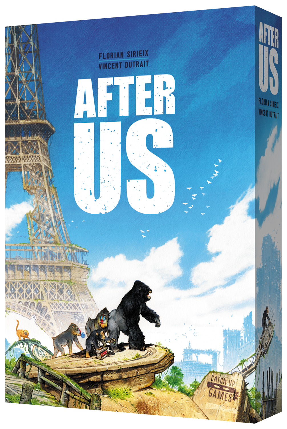 Pour l'emporter dans After us, vous devez atteindre 80 points de victoire avant vos adversaires. à chaque tour, tous les joueurs vont simultanément piocher les 4 premiÚres cartes de leur deck puis les assembler, de gauche à droite, pour former des cartouches d'activation. Ils vont ensuite résoudre ces cartouches, un par un, de gauche à droite, pour gagner des ressources, des points de victoire ou activer les capacités spéciales de leurs primates. Tout le sel du jeu consiste donc à réaliser son assemblage judicieusement, en fonction de ce qu'on souhaite obtenir des cartes que l'on a piochées.