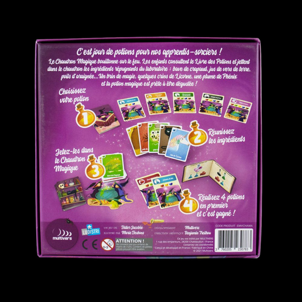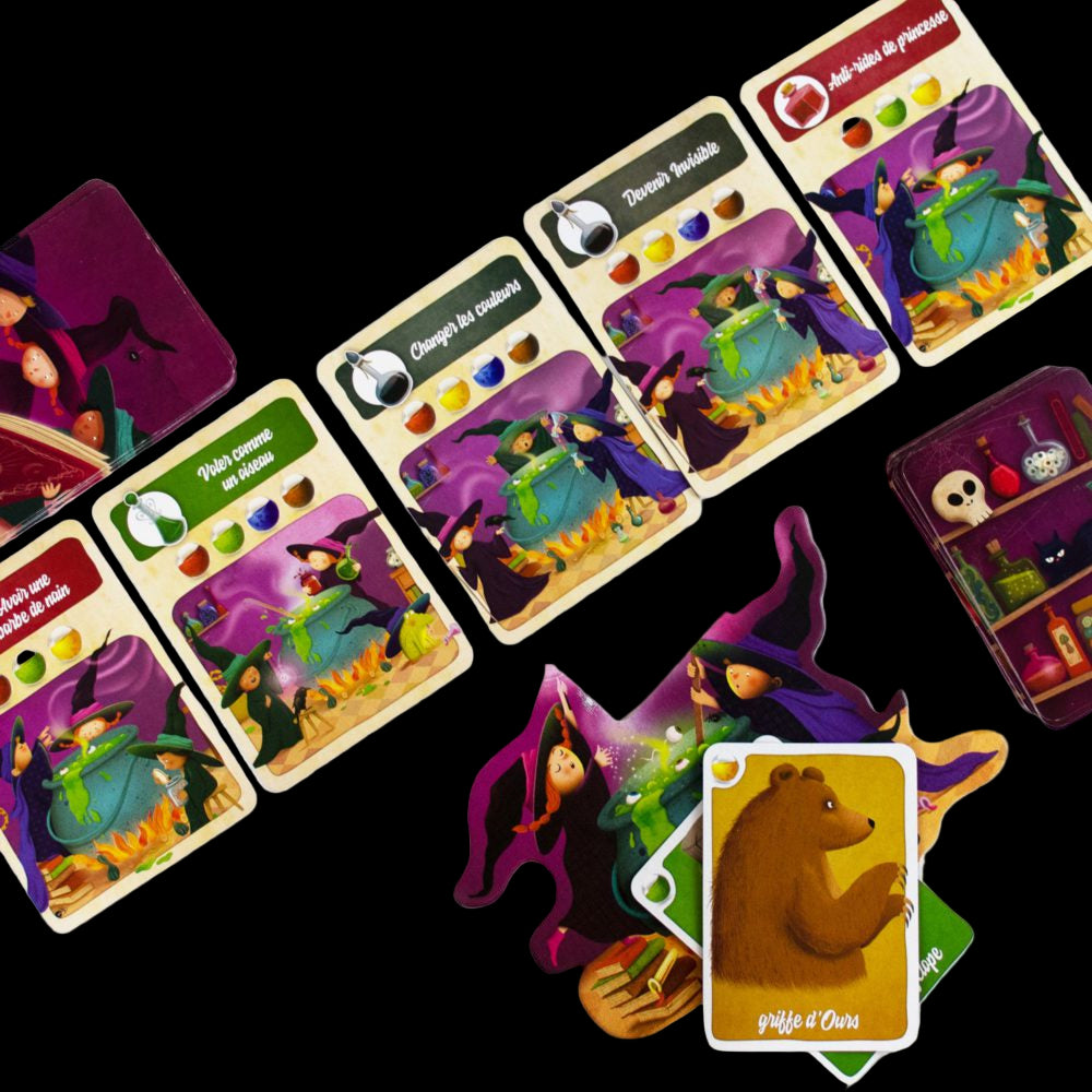 Les enfants consultent le Livre des Potions et jettent dans le chaudron les ingrédients répugnants du laboratoire : bave de crapaud, jus de vers de terre... et la potion magique est prête à être dégustée ! Chaque joueur choisit un manuel de sorcellerie qui lui donne le choix entre 2 «contrats» à remplir. Il faudra obtenir toutes les potions de l’une ou l’autre page. Pour obtenir les potions requises, il faudra jeter des ingrédients dans le chaudron ! Les joueurs peuvent aussi négocier et s’entraider, selon les intérêts de chacun.
