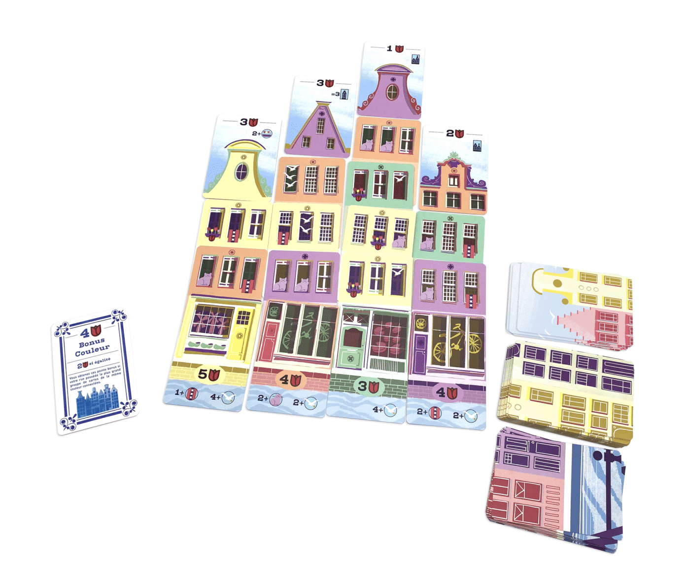 DansBellevue, façonnez votre propre rue en alignant de magnifiques maisons flamandes le long du canal. À chaque tour, choisissez une carte à poser… puis passez le reste de votre main à vos adversaires. Objectifs, couleurs, toits, boutiques : chaque décision influence la valeur de votre rue et vos chances de l’emporter.