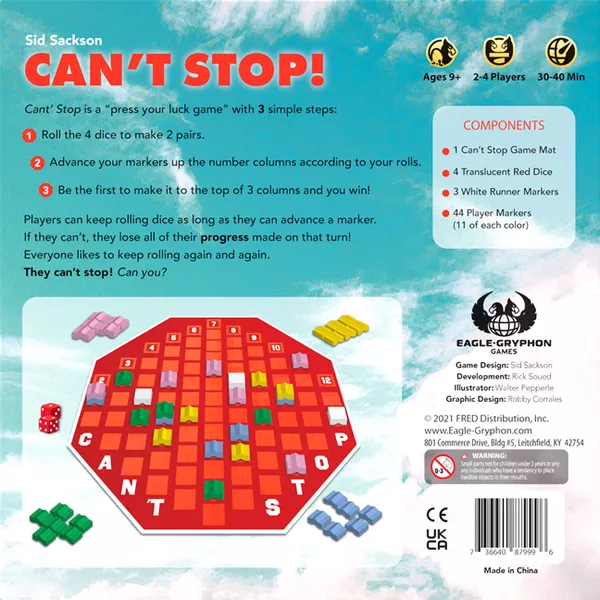 Players try to win three of the eleven number columns as quickly as possible. To do this, they roll the four dice and form two pairs, which determine the columns on which they may first place the white cones (the runners). During their turn, players may roll the dice as long as they wish –provided that they can place or move at least one of the runners. If, after rolling the dice, a player is unable to move, his turn ends immediately and he loses everything that he achieved during that turn. He should have stopped in time… but he didn’t! Everybody likes to try just once more—and then maybe once more…