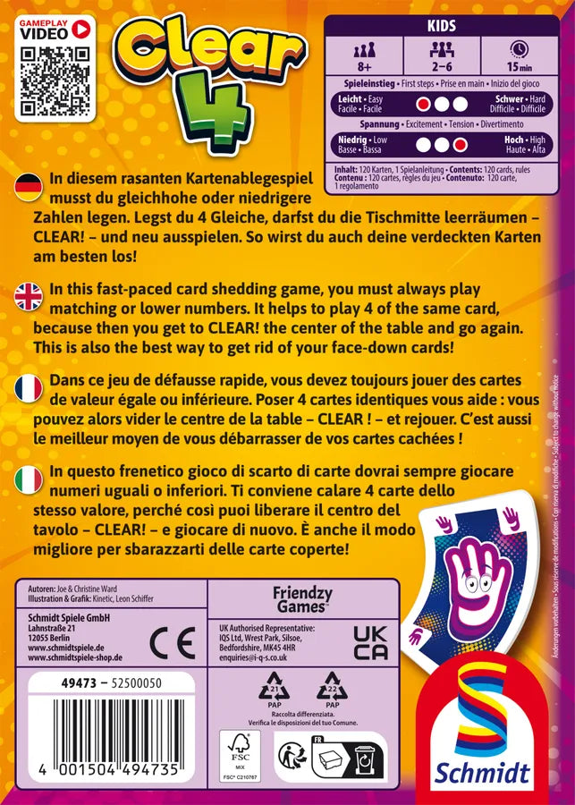 Dans ce jeu de défausse rapide, vous devez toujours jouer des cartes de valeur égale ou inférieure. Poser 4 cartes identiques vous aide : vous pouvez alors vider le centre de la table – CLEAR ! – et rejouer. C'est aussi le meilleur moyen de vous débarrasser de vos cartes cachées !