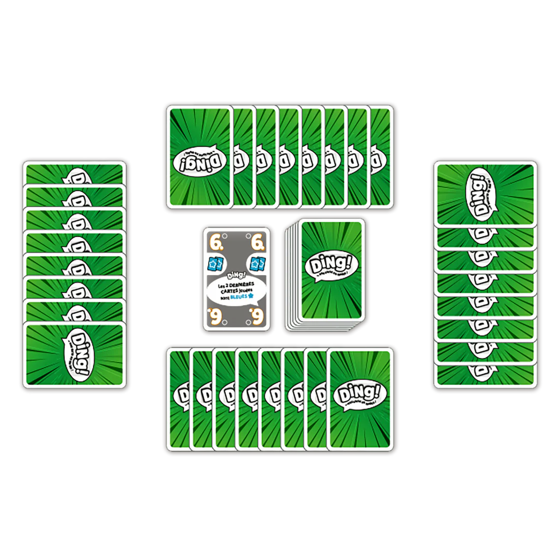 QUI SERA LE PREMIER À SE DÉBARRASSER DE TOUTES SES CARTES ? Gardez à l‘œil les autres joueurs… Quelqu‘un utilise son téléphone ? Ou répond à une question par « OUI » ? Bâille ou passe son tour ? Alors criez… DING ! C‘est le moment de jouer votre carte correspondante pour vous en débarrasser au plus vite ! N‘hésitez pas à provoquer les événements dont vous avez besoin !
