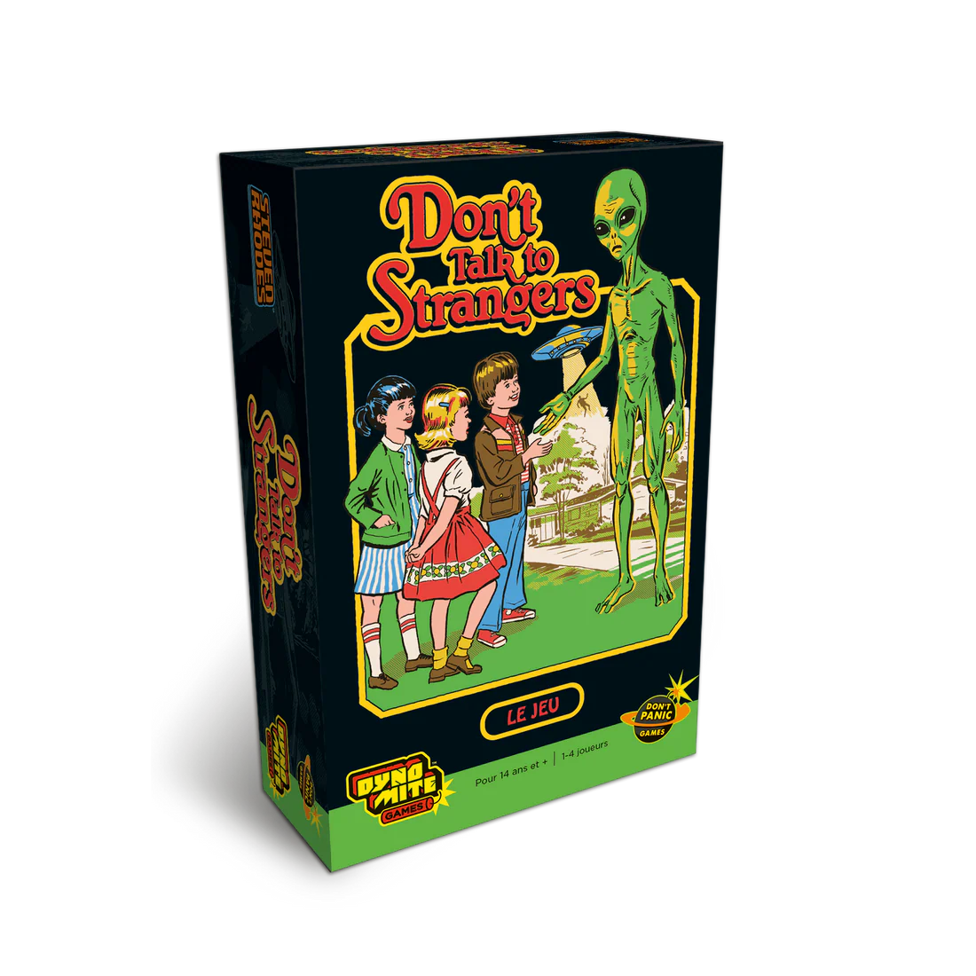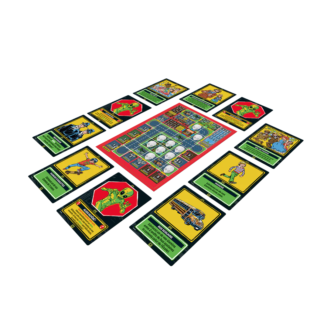 Seulement voilà, de vilains inconnus venus d'ailleurs ont envahi le quartier;! Papa et maman ont été très clairs là-dessus, il ne faut jamais parler aux inconnus. À votre tour, jouez vos cartes pour aider vos gamins à se déplacer depuis l'école jusqu'aux lieux sûrs rapportant le plus de points. Mais attention;! Les envahisseurs débarquent au fil de la partie, et risquent d'enlever vos gamins, ce qui ferait mauvais genre… Plongez dans l'univers rétro, hilarant et décalé de Steven Rhodes !