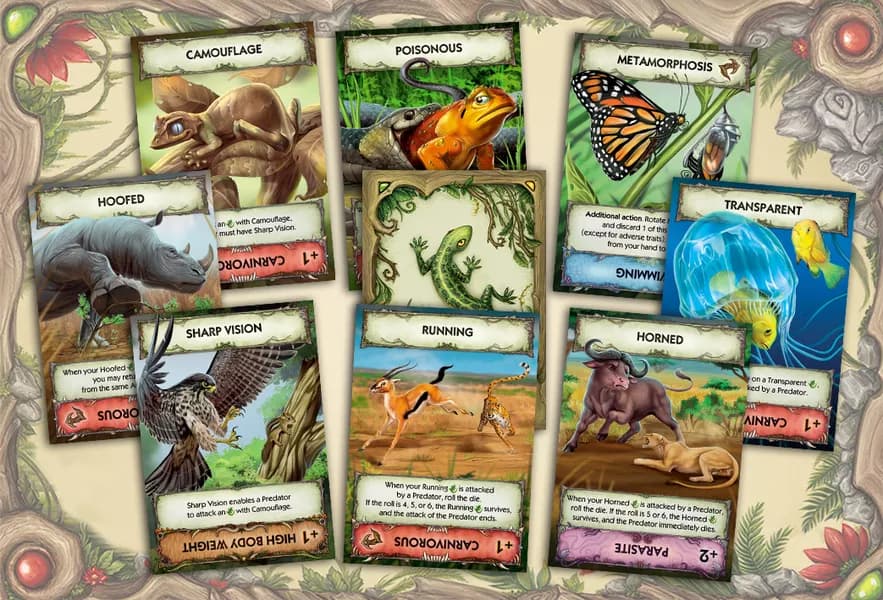 Évolution – Le Nouveau Monde est une version actualisée et étendue du jeu de base Evolution : L’origine des espèces. Il comprend à la fois des caractéristiques animales bien connues et de nouvelles, accompagnées de descriptions raffinées et d’illustrations colorées. La nourriture est désormais générée à l’aide de cartes Zone, et les animaux peuvent s’abriter pour se cacher des prédateurs.