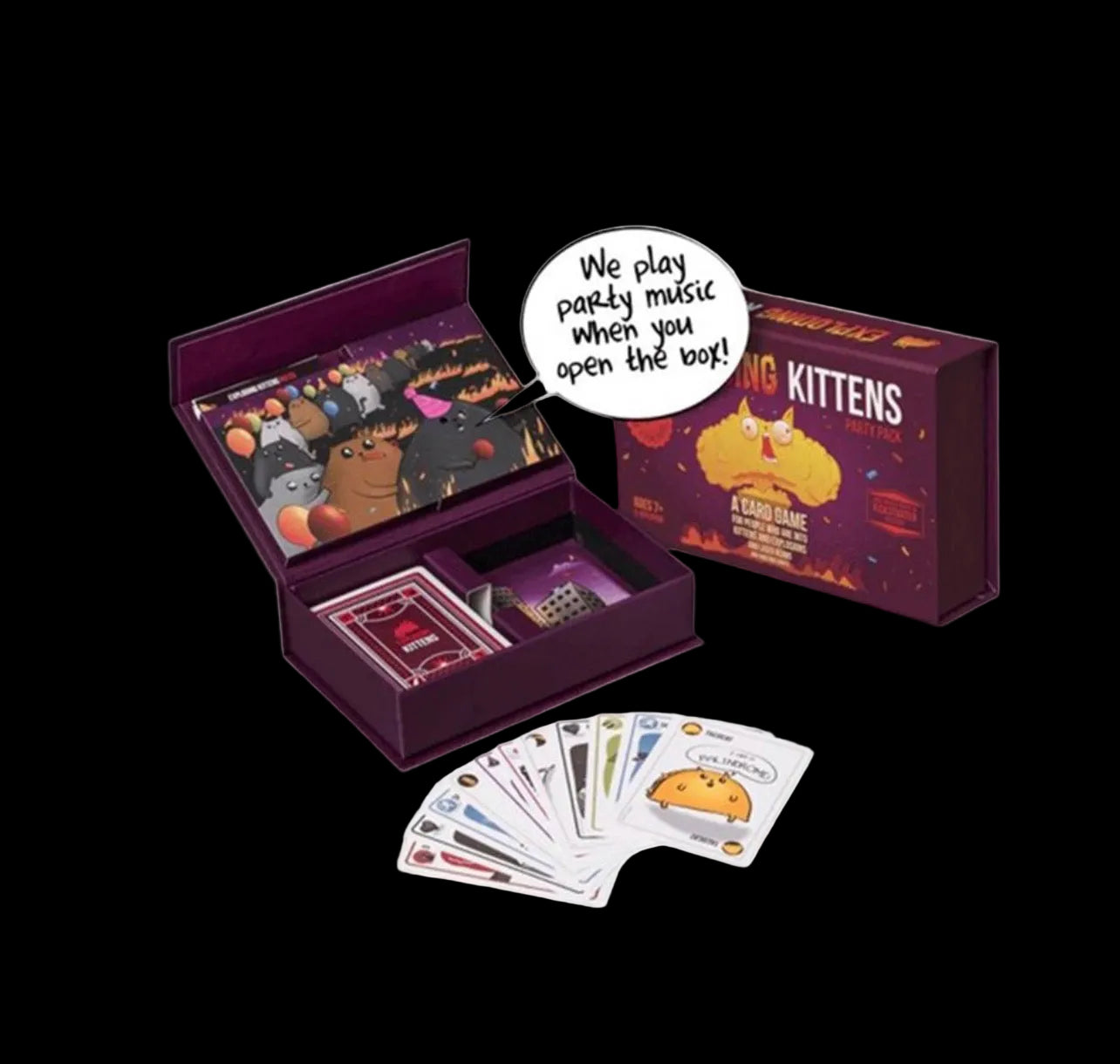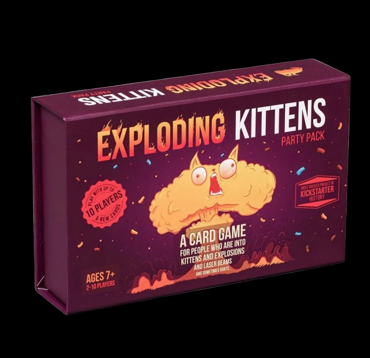 Exploding Kittens: Party Pack Edition is a highly-strategic, kitty powered version of Russian Roulette that can support up to 10 players. Players draw cards until somebody draws an Exploding Kitten, at which point they explode and are out of the game. To avoid exploding, they can defuse the kitten with a laser pointer or catnip sandwich, OR use powerful action cards to move or avoid the Exploding Kitten. Betray your friends. Try not to explode. The last player left alive wins.
