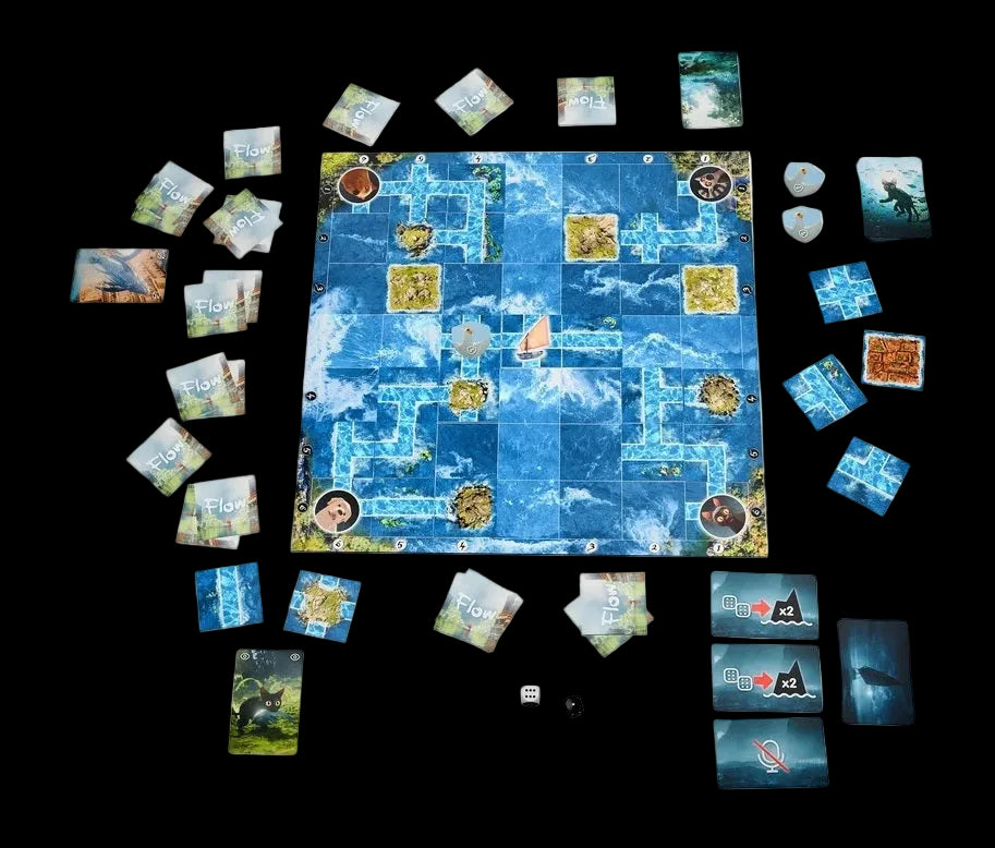 Flow est un jeu coopératif où les joueurs travaillent ensemble pour connecter quatre espaces d’animaux à la tuile du bateau au centre du plateau en piochant et en jouant des tuiles. Si les joueurs n’ont plus de tuiles et que les animaux n’ont pas été connectés au bateau, ils perdent tous. En plus de cela, le jeu utilise une minuterie, et chaque fois que le temps s’épuise, les joueurs lancent deux dés qui leur indiquent où la vague géante frappe et emportent les tuiles déjà placées. Avez-vous ce qu’il faut pour sauver les animaux ?