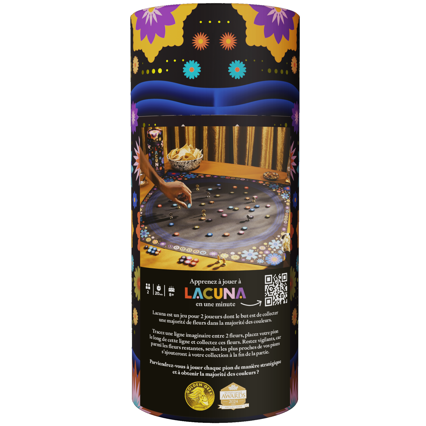 Lacuna est un jeu pour 2 joueurs qui consiste à ramasser des fleurs sur un étang la nuit. Tracez une ligne imaginaire entre deux fleurs, placez votre pion et récupérez les deux fleurs. Gagnez en collectant le plus de fleurs dans le plus de couleurs !