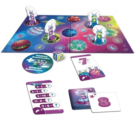 SOS Météo! On annonce une pluie torrentielle de comètes dans la galaxie Nébula Calcula. Vite, il faut mettre sa flotte spatiale à l’abri des intempéries. Quel joueur saura faire preuve de stratégie et utiliser ses habiletés en calcul mental afin d’être le premier à ramener tous ses Nébuliens en lieu sûr?