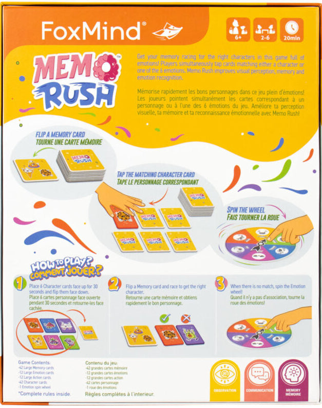 Mémorise rapidement les bons personnages dans ce jeu plein d’émotions! Les joueurs pointent simultanément les cartes correspondant à un certain personnage ou bien à l’une des 6 émotions du jeu. Améliore ta perception visuelle, ta mémoire et ta reconnaissance émotionnelle avec Mémo Rush.