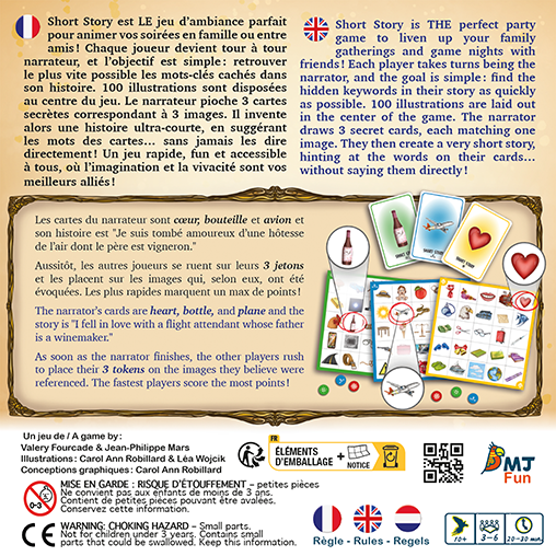 Chaque joueur devient tour à tour narrateur, et l’objectif est simple : retrouver le plus vite possible les mots-clés cachés dans son histoire. 100 illustrations sont disposées au centre du jeu. Le narrateur pioche 3 cartes secrètes correspondant à 3 images. Il invente alors une histoire ultra-courte, en suggérant les mots des cartes… sans jamais les dire directement ! Un jeu rapide, fun et accessible à tous, où l’imagination et la vivacité sont vos meilleurs alliés !