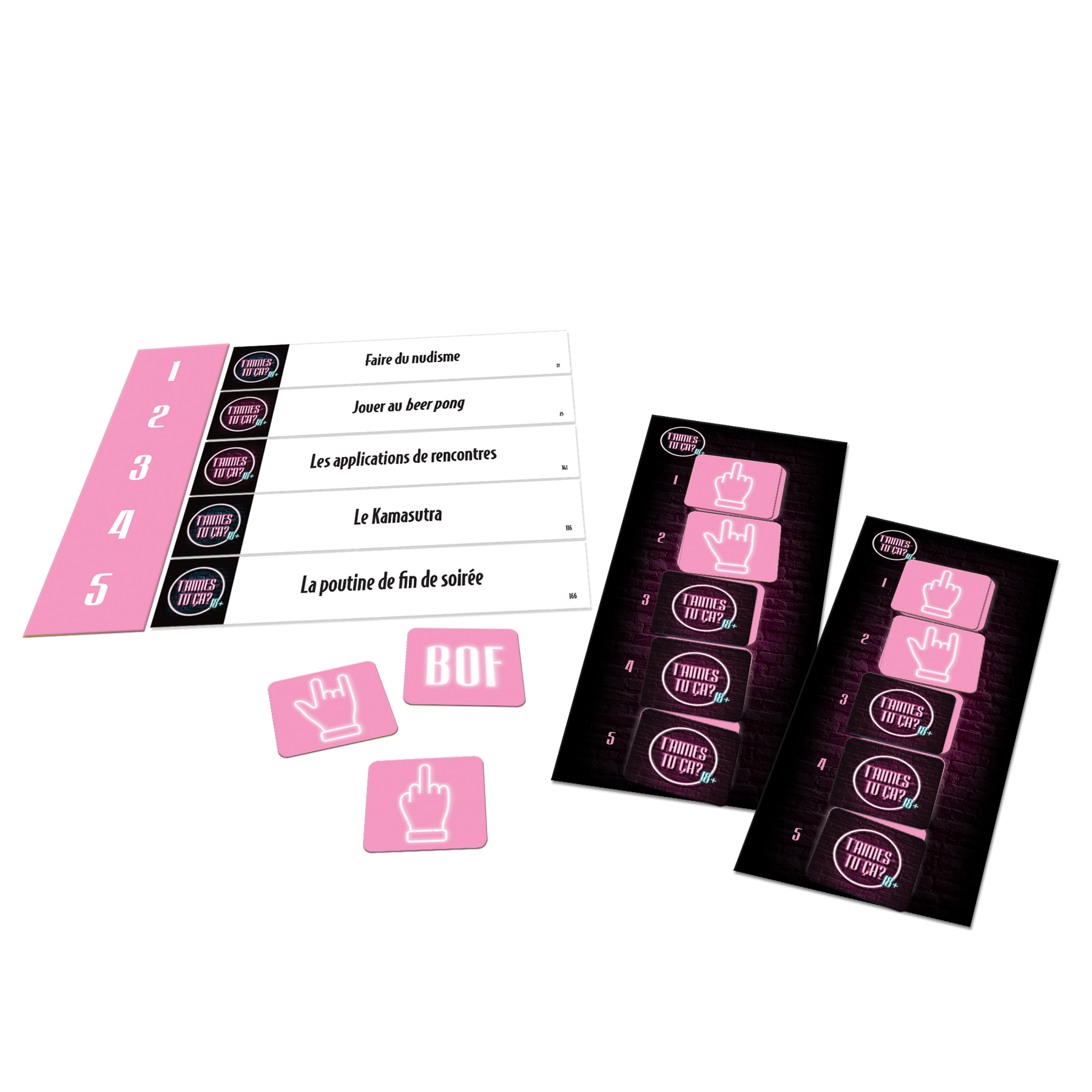 Pour marquer des points, les coéquipiers doivent placer pour chaque énoncé le même jeton de niveau d’appréciation. Dans cette version 18+, les joueurs devront mettre de côté leur timidité et leur pudeur. Le jeu idéal pour susciter des rires, des discussions tordues, mais surtout des révélations surprenantes!