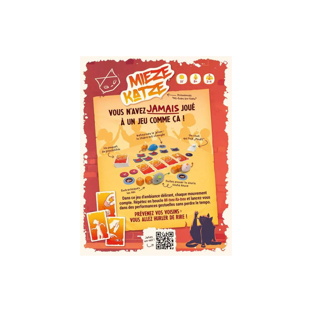 Dans Mieze Katze, les joueurs se lancent dans une aventure où ils doivent coopérer pour créer des performances rythmiques, mais attention, pas question de perdre le tempo ! Chaque joueur pioche une carte qui lui indique une action à réaliser — un geste farfelu, un bruit étrange ou même un mouvement totalement improbable. Le but ? Rester parfaitement synchronisés tout en maintenant le rythme "Mieze Katze", une sorte de danse folle que tout le monde doit suivre. En gros, c'est comme être dans un groupe de musique où personne n’a la même partition, mais tout le monde essaie de ne pas éclater de rire ! Un mélange parfait de coordination, de chaos et de bonne humeur !