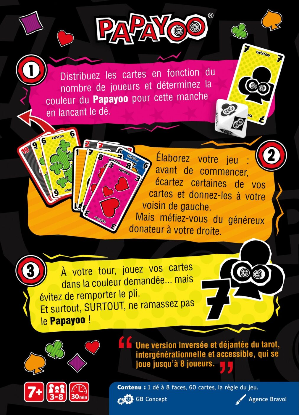 Dans ce jeu de plis aux cinq couleurs, il ne faut surtout pas marquer de points ! Pour se faire, évitez de remporter des plis mais surtout de ramasser les Payoos et le maudit Papayoo, ce 7 dont la couleur est déterminée au hasard à chaque début de manche. Papayoo : une alternative vivifiante à tous les jeux de cartes traditionnels.