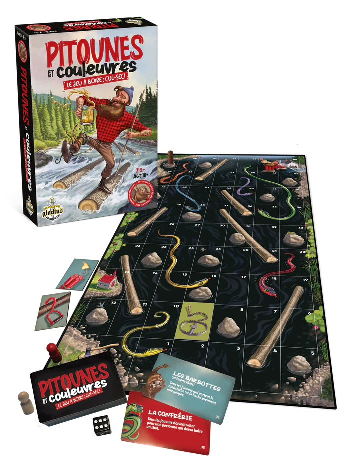Plongez dans l'aventure avec ce jeu à saveur historique, remontez la rivière, surmontez les embûches, rendez-vous au moulin et « calez » votre verre pour remporter la partie, mais surtout évitez la gorgée de trop!