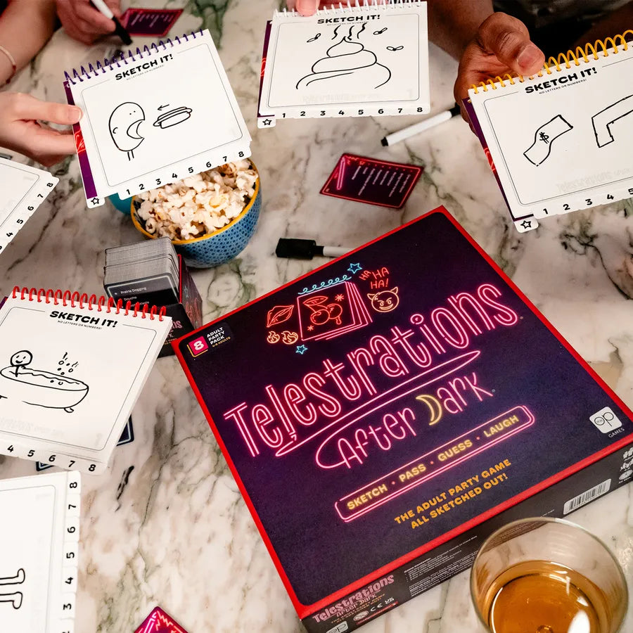 Telestrations After Dark is the adults-only version of the #1 LOL party game Telestrations. Draw what you see then guess what you saw for hilarious, weird, irresponsible and just plain wrong outcomes. Telestrations After Dark is “adults only” miscommunication at its best!