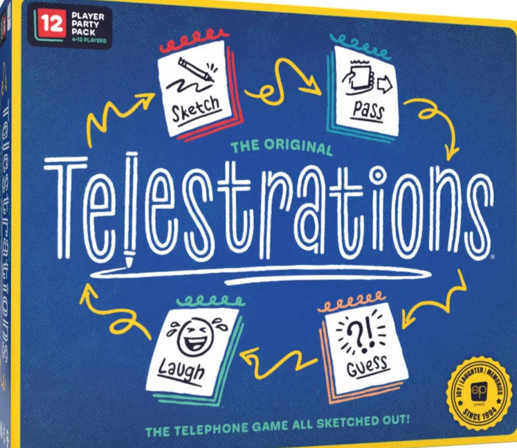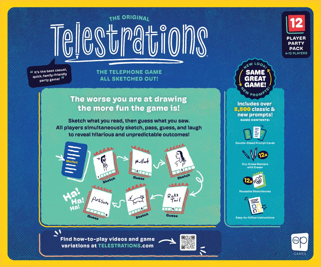 The Telestrations 12 Player Party Pack is the same award-winning sketch, pass & guess fun as The Original 8 Player Telestrations; only now the outcomes can go even further sideways with more players and 600 new words!