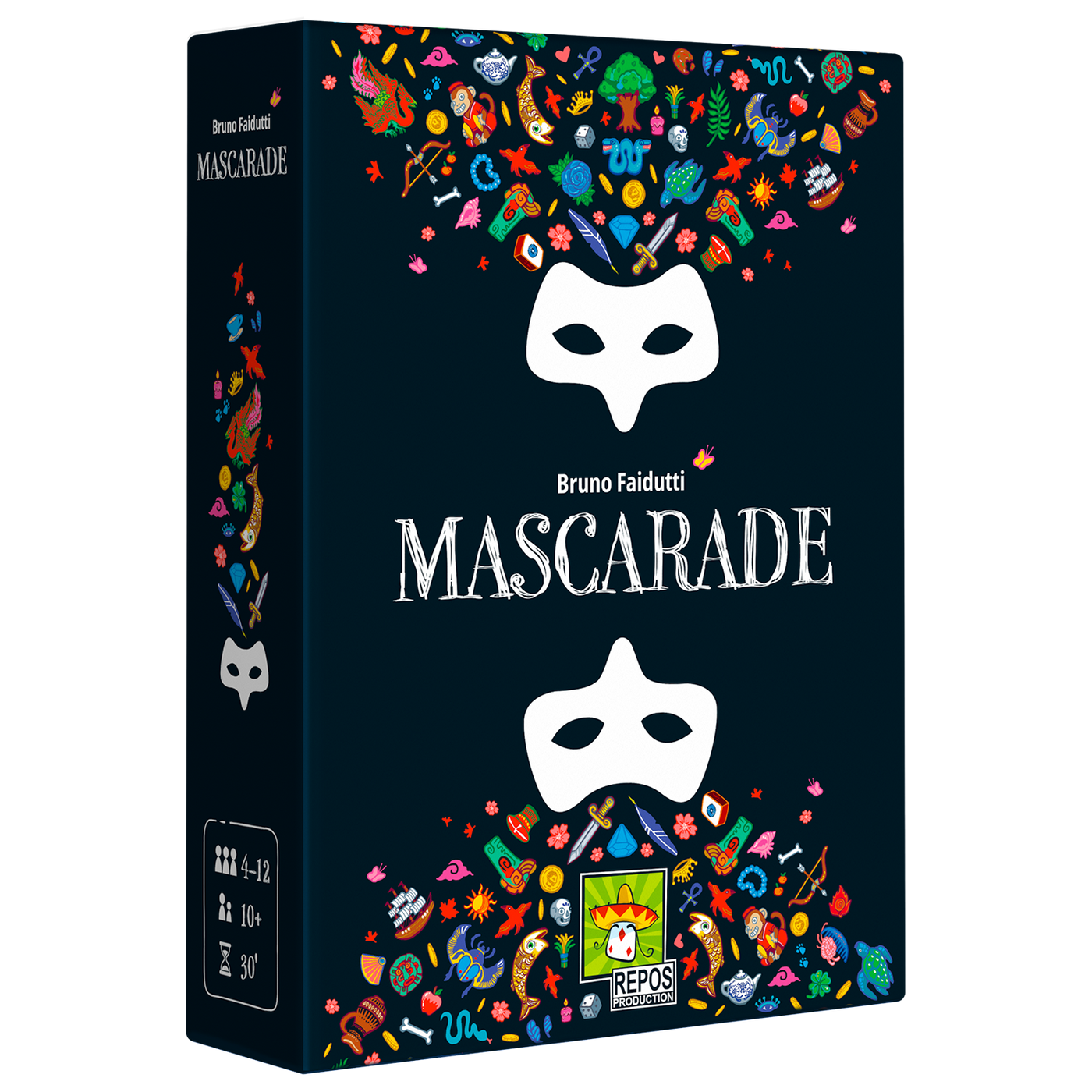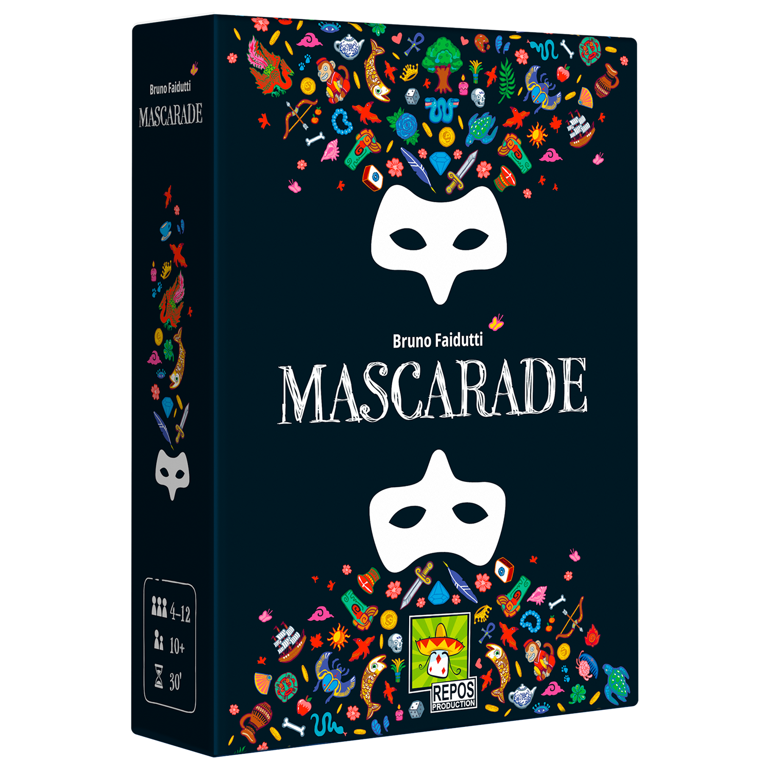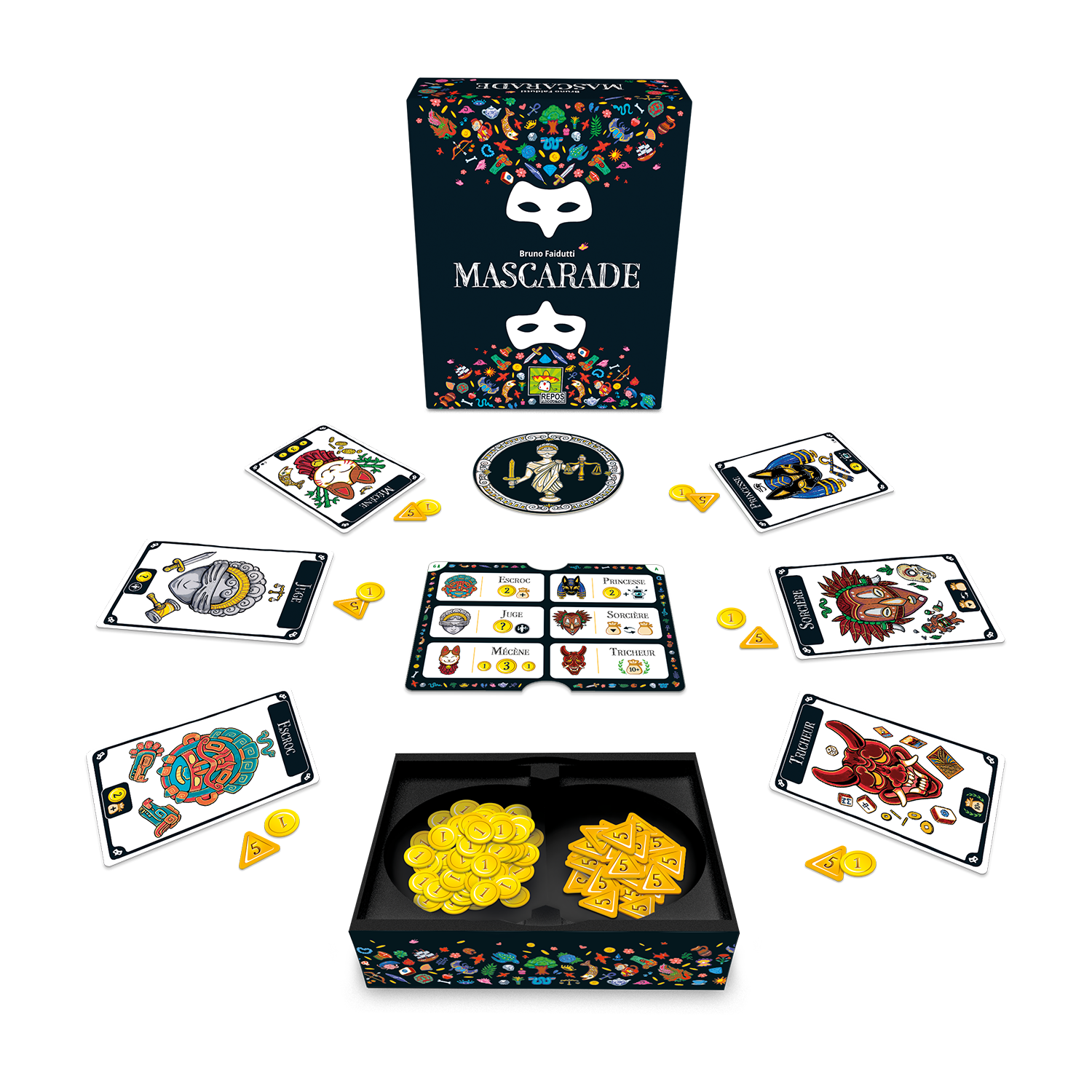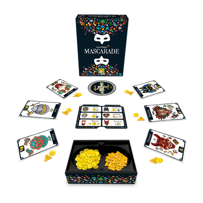 Roi, Sorcière, Voleur... Faites tomber les masques ! Entrez dans la Mascarade où les apparences sont souvent trompeuses. Portez le bon Masque au bon moment, profitez de son pouvoir et amassez une fortune suffisante pour remporter la partie. La tâche ne sera pas facile ; les Masques s’échangent entre les joueurs… Saurez-vous vous rappeler quel Masque se cache derrière votre carte ?